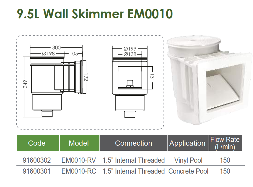 – Mục đích sử dụng của EM0010-RC là thu bụi và rác trên mặt nước hồ bơi, giảm áp suất của nước hút vào skimmer, giúp tiết kiệm diện tích, cân bằng bể bơi và không phải xây máng tràn. Từ đó giảm thiểu chi phí xây dựng hồ bơi. Lưu lượng phù hợp cho hiệu suất làm việc cao giúp nước hồ bơi được cân bằng và sạch sẽ hơn.