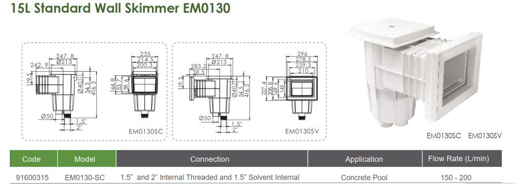 – Mục đích sử dụng của EM0130-SC là thu bụi và rác trên mặt nước hồ bơi, giảm áp suất của nước hút vào skimmer, giúp tiết kiệm diện tích, cân bằng bể bơi và không phải xây máng tràn. Từ đó giảm thiểu chi phí xây dựng hồ bơi. Lưu lượng phù hợp cho hiệu suất làm việc cao giúp nước hồ bơi được cân bằng và sạch sẽ hơn.